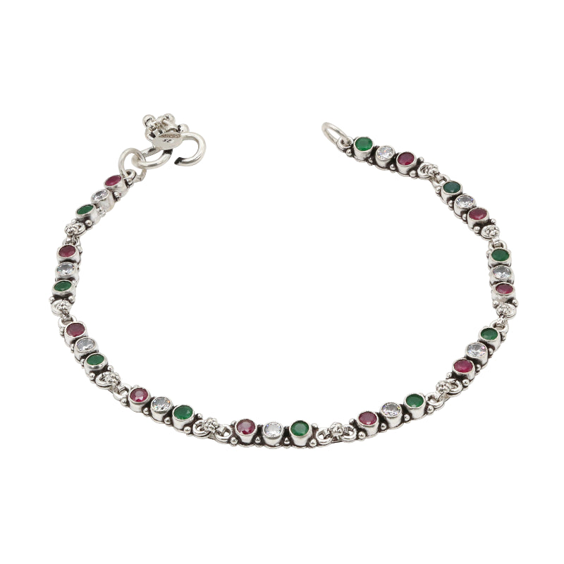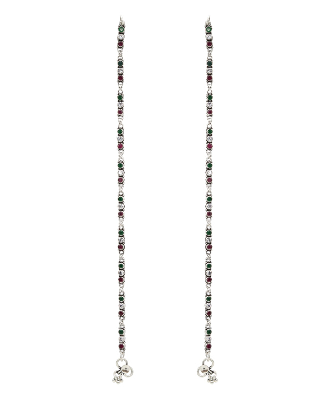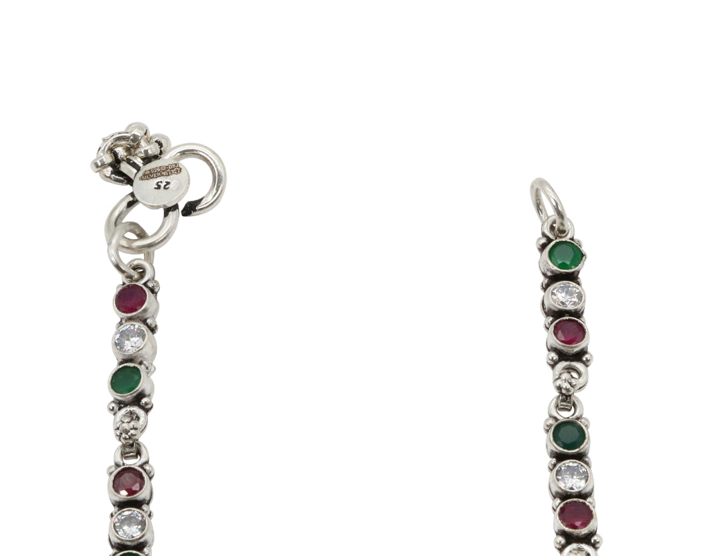 Adorn your ankles with the delicate sparkle of the Bindu Payal, a charming anklet crafted in oxidized silver. This piece features a fine chain embellished with a vibrant sequence of small, round-cut semi-precious stones in rich ruby red and lush emerald green, punctuated by the brilliance of white stones.