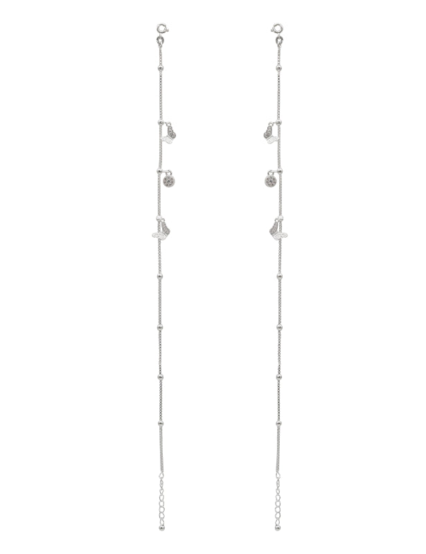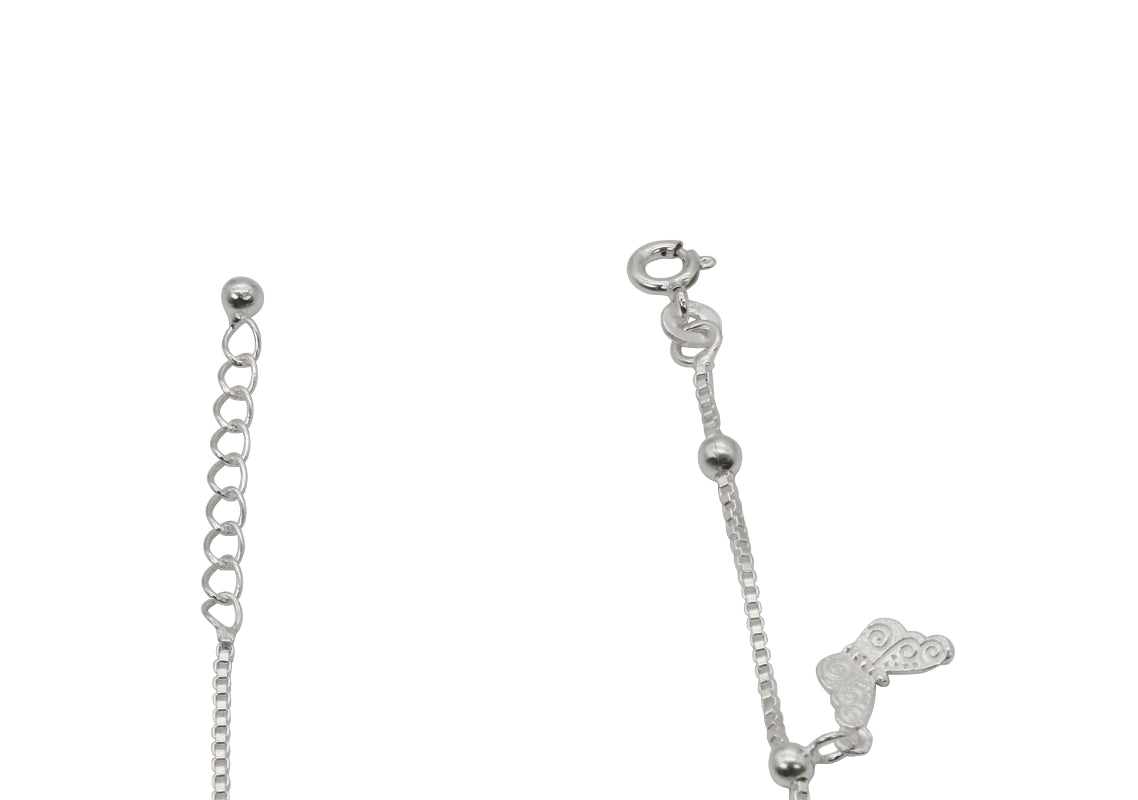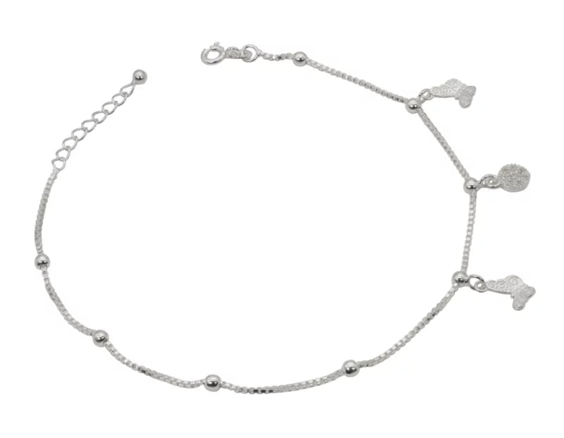 Adorn your ankles with the whimsical charm of the Chanchal Payal, a delightful anklet crafted in polished sterling silver. This delicate chain features small silver beads interspersed along its length, leading to a playful arrangement of dangling charms.