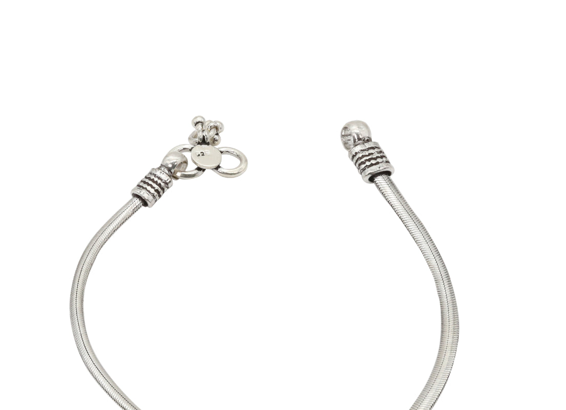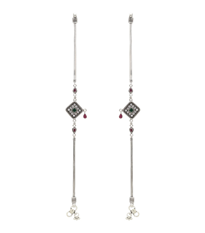 Adorn your ankles with the geometric grace of the Chaturanga Payal, a striking anklet crafted in polished sterling silver. This piece features a sleek snake chain that draws the eye to a prominent diamond-shaped motif at the center. The intricate detailing within the diamond showcases a vibrant green stone surrounded by sparkling white accents, with a delicate ruby teardrop pendant adding a touch of color below.