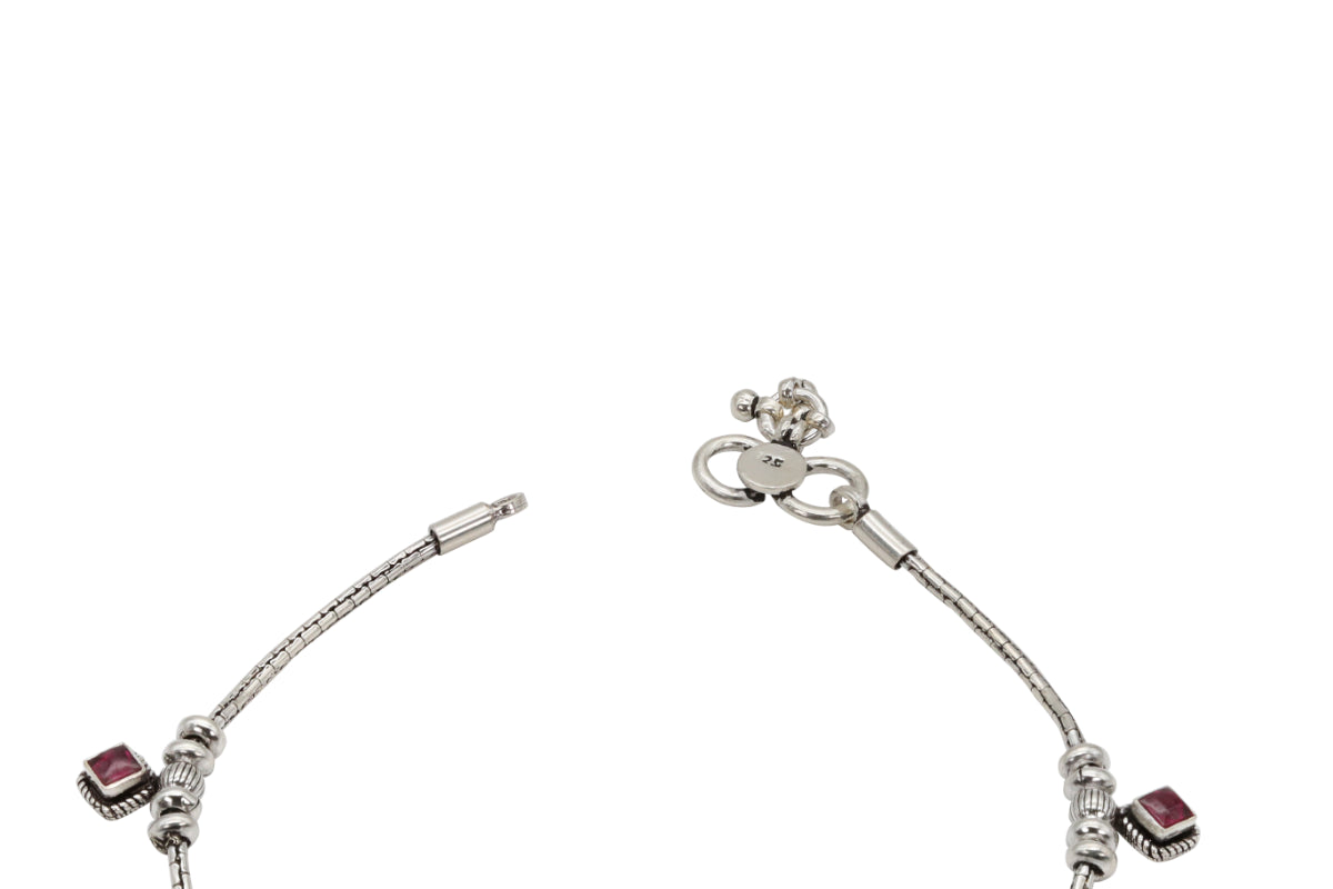 Elevate your style with the unique charm of the Crimson Cube Anklet. This striking piece is a perfect fusion of vintage appeal and modern design, crafted from 92.5 hallmark oxidised silver. The anklet features a delicate, textured chain, gracefully adorned with a series of square-shaped charms. Each charm is meticulously set with a vibrant semi-precious red stone, creating a captivating contrast against the antique silver finish. The timeless design and bold color make this anklet a versatile and sophisticated accessory, perfect for adding a touch of elegance to any ensemble.