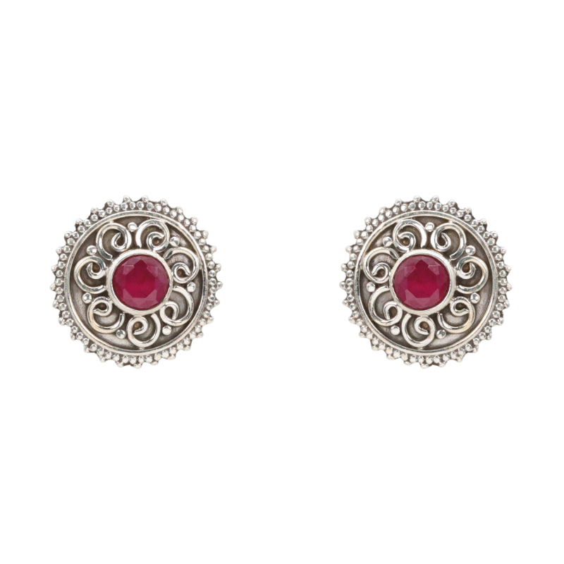 Introducing the exquisite Crimson Scroll 92.5 Hallmark Antique Silver Stud Earrings, a harmonious blend of traditional artistry and captivating design. These stunning round earrings are meticulously crafted from 92.5 sterling silver with a rich antique finish, featuring a vibrant semi-precious red stone at their heart.