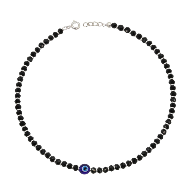 These captivating anklets are crafted from gleaming white silver, featuring a delicate chain adorned with striking black beads. In India, black beads are traditionally believed to ward off negativity and bring good fortune. The central ‘eye’ bead, a symbol of divine protection, adds a unique and meaningful touch.
