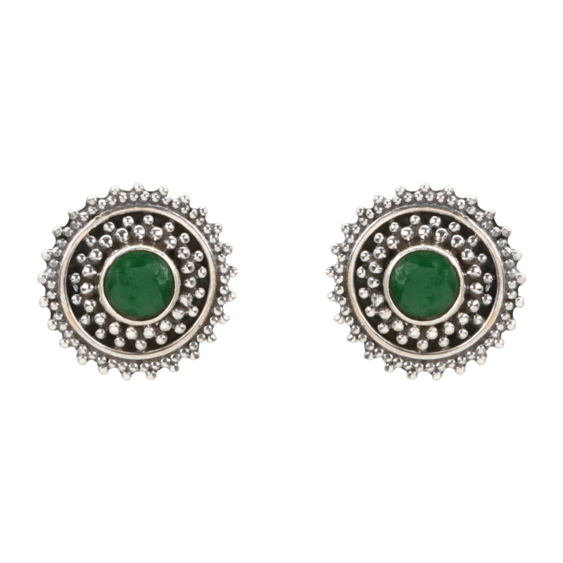 Discover the timeless allure of these Emerald Aura Antique Silver Stud Earrings. Crafted from 92.5 Hallmark Antique Silver, these circular studs feature a captivating design with a textured, beaded outer rim that beautifully frames the central stone.
