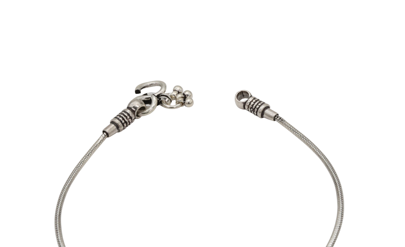 The Garnet Petal Anklet is a graceful blend of rich color and intricate design. This exquisite piece is crafted from 92.5 hallmark oxidised silver, featuring a sleek, flexible snake chain. The centerpiece is a captivating floral motif, where a brilliant semi-precious red stone is set alongside a halo of sparkling cubic zirconia (CZ). A single, pear-shaped semi-precious green stone dangles gracefully below, adding a touch of elegant contrast. This anklet’s unique charm and timeless appeal make it a perfect accessory for adding a touch of refined beauty to any look.