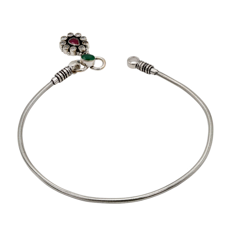 The Garnet Teardrop Anklet is a graceful blend of rich color and sophisticated design. This exquisite piece is crafted from 92.5 hallmark oxidised silver, featuring a sleek, flexible snake chain. The centerpiece is a captivating floral motif, where a brilliant semi-precious red stone is set alongside a halo of sparkling cubic zirconia (CZ). A single, pear-shaped semi-precious green stone dangles gracefully below, adding a touch of elegant contrast. This anklet’s unique charm and timeless appeal make it a perfect accessory for adding a touch of refined beauty to any look.