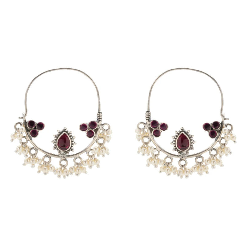 This exquisite Chand Bali earring showcases traditional Indian design with its delicate silver hoop and intricate pendant.