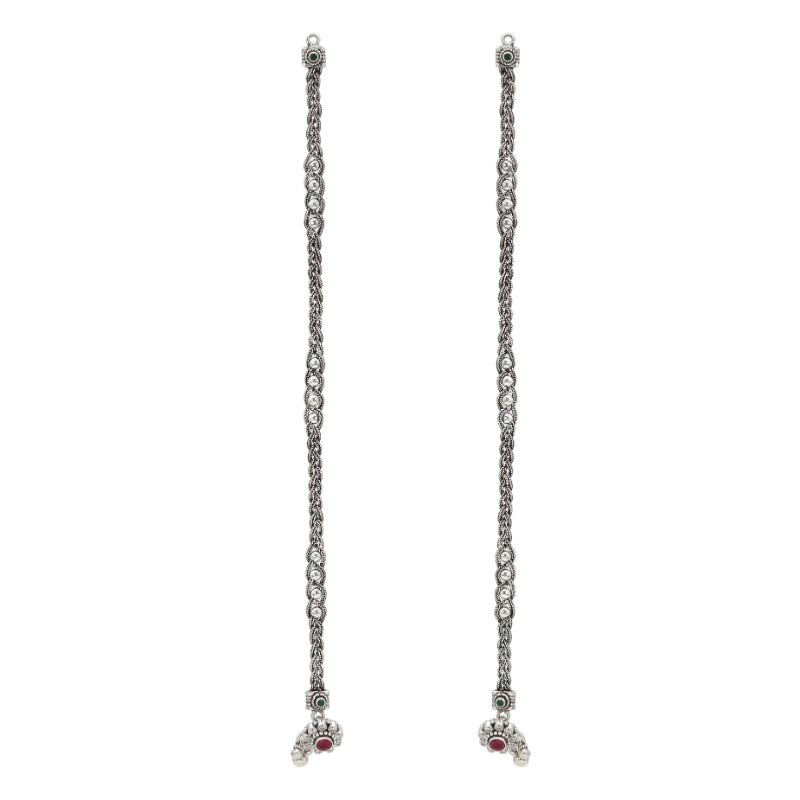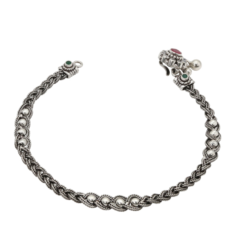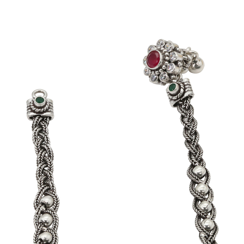 Adorn your ankles with the distinctive charm of the Gujariya Payal. This anklet showcases a beautifully textured, interwoven chain of oxidized silver, accented with delicate silver beads. The clasp area features intricate detailing, highlighted by small, vibrant semi-precious green and red stones, adding a touch of traditional allure.