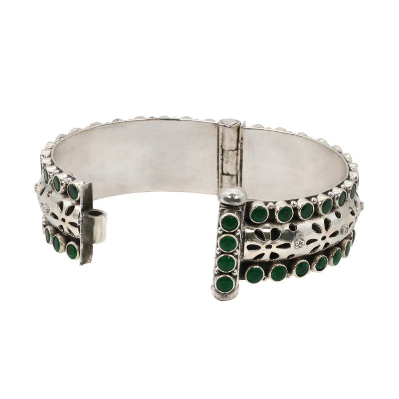Adorn your wrist with the refreshing beauty of the Harita Pushpa Bangle, an openable, free-size bangle meticulously crafted from 92.5% hallmark oxidized silver. This piece features delicate, stylized floral (pushpa) cutwork, interspersed with rows of vibrant, semi-precious green stones.
