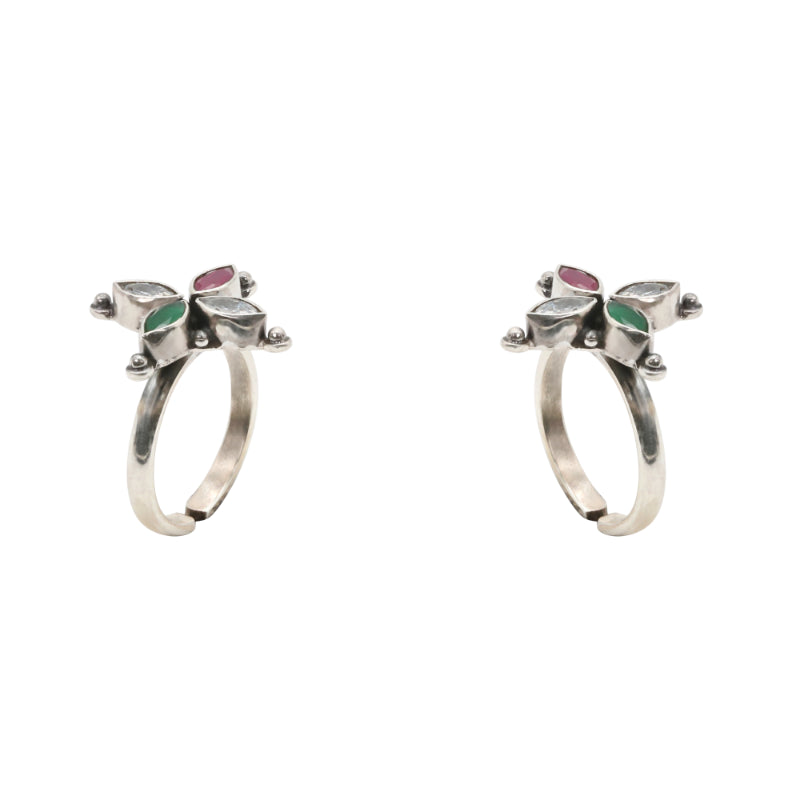 Express your individual flair with our Indradhanush Mani Toe Rings. These distinctive pieces are handcrafted from 92.5 hallmarked oxidized silver and feature a captivating design with a trio of colorful semi-precious stones. The adjustable band ensures comfortable wear, allowing you to showcase your personal style with a touch of vibrant charm.