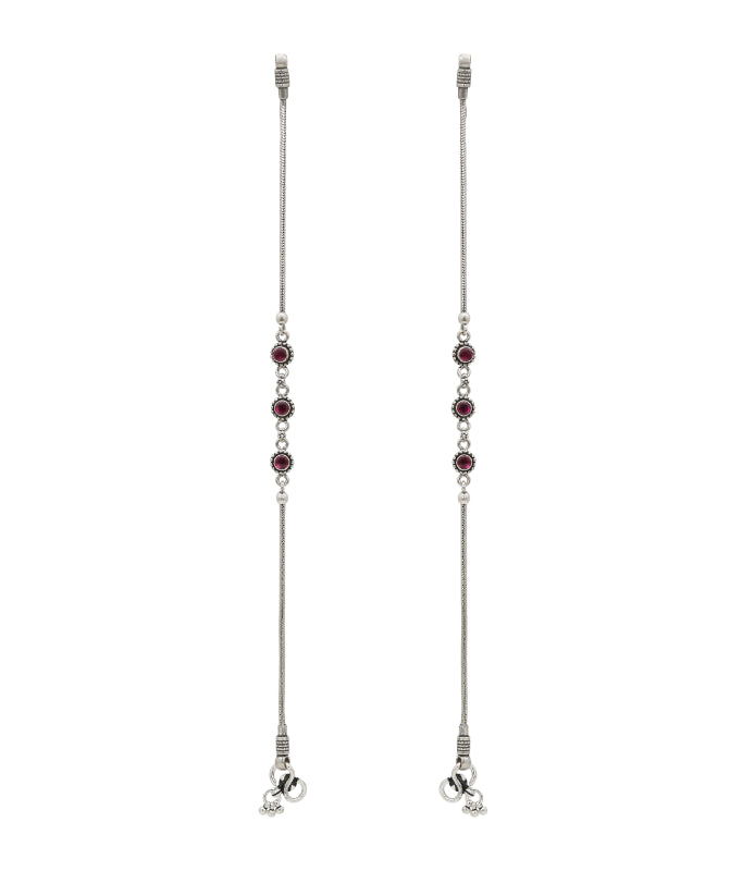 Adorn your ankles with the subtle allure of the Lalima Payal, a gracefully designed anklet in polished sterling silver. This delicate piece features a smooth snake chain that elegantly embraces the ankle. Three exquisite ruby-red stones, each set in a detailed silver casing and linked by intricate silverwork, provide captivating pops of color and brilliance.