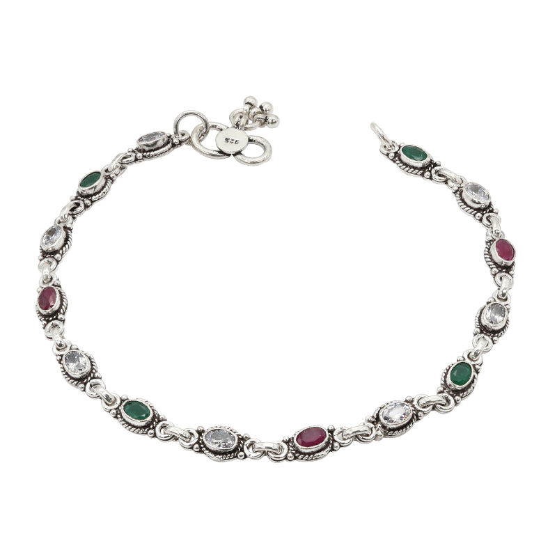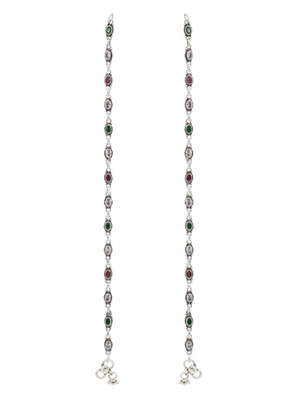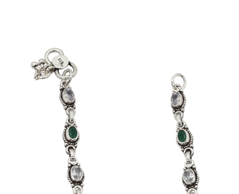 Grace your ankles with the subtle elegance of the Latika Payal, a charming anklet crafted in oxidized silver. This piece features a slender chain adorned with a sequence of vibrant oval-cut semi-precious stones in rich ruby red and lush emerald green, interspersed with sparkling white stones.