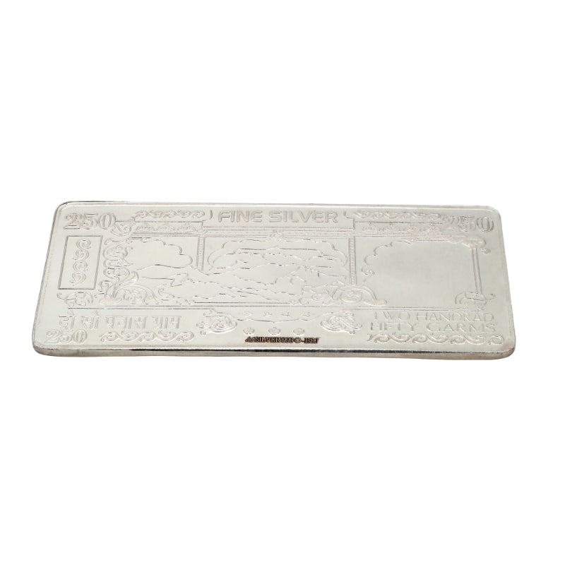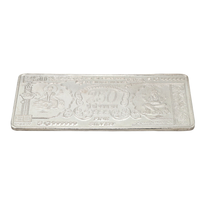 This is a 250-gram silver bar crafted from 92.5 Hallmark Silver, showcasing a unique design inspired by Hindu mythology. The bar features intricate engravings depicting various deities and auspicious symbols, creating a visually stunning and spiritually significant piece.