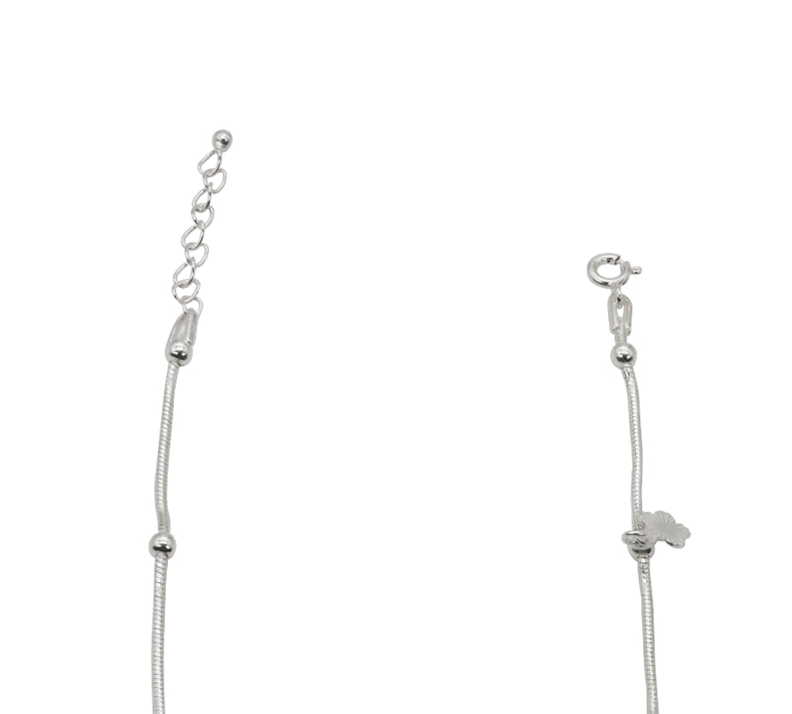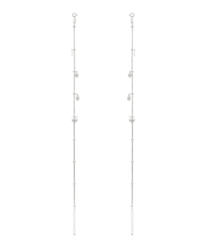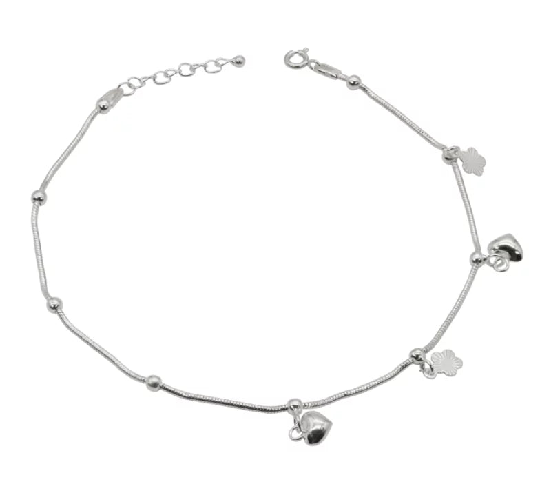 Adorn your ankles with the playful elegance of this sterling silver charm anklet. A fine snake chain is delicately accented with small silver beads, leading to a whimsical arrangement of dangling charms.