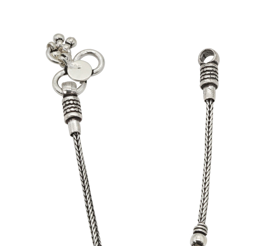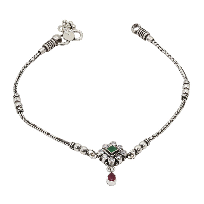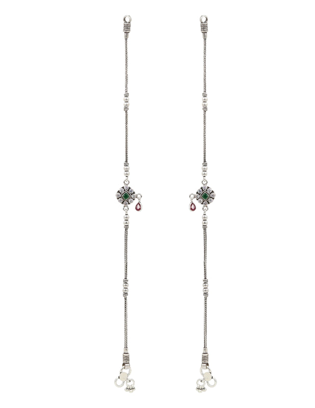 Adorn your ankles with the subtle charm of the Madhuri Payal, a beautifully crafted anklet in oxidized silver. This piece features a fine, textured chain leading to an elegant central motif. The focal point is a delicate arrangement of sparkling white stones surrounding a vibrant green square stone, with a single ruby red teardrop pendant adding a touch of color and grace.