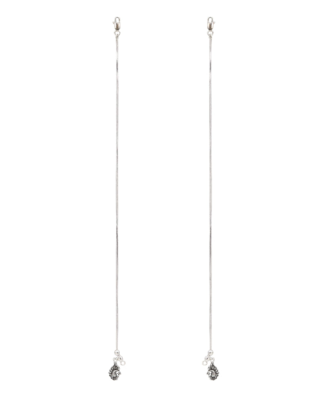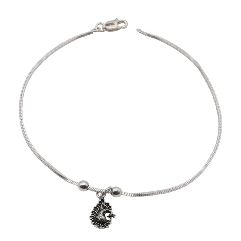 Adorn your ankles with the majestic charm of the Mayuri Payal, a delicate anklet crafted in sleek sterling silver. This fine snake chain is accented by two small silver beads that gracefully lead to a beautifully detailed peacock pendant.