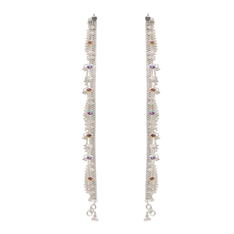 These “Nanhi Pari” anklets, meaning “Little Fairy,” are a pair of exquisitely crafted pieces of 92.5 hallmark silver, designed to adorn the delicate feet of a baby girl with gentle sparkle and charm. Their elongated, intricately designed chains add a touch of traditional elegance, perfect for special occasions. The anklets feature a delicate pattern of tiny, spherical silver beads, interspersed with ornate motifs that showcase the meticulous craftsmanship.