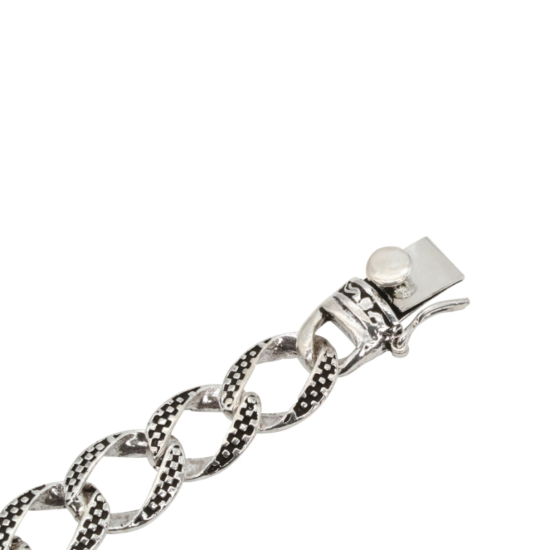 This distinctive bracelet is crafted from 92.5% hallmark sterling silver with a carefully applied oxidized finish, enhancing its intricate details and giving it a slightly vintage aesthetic. The bracelet features a series of interconnected links, each showcasing a unique, textured pattern that adds visual interest and depth.