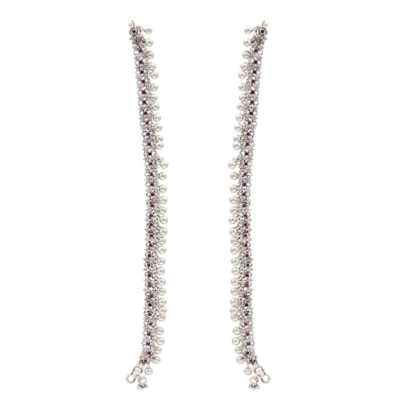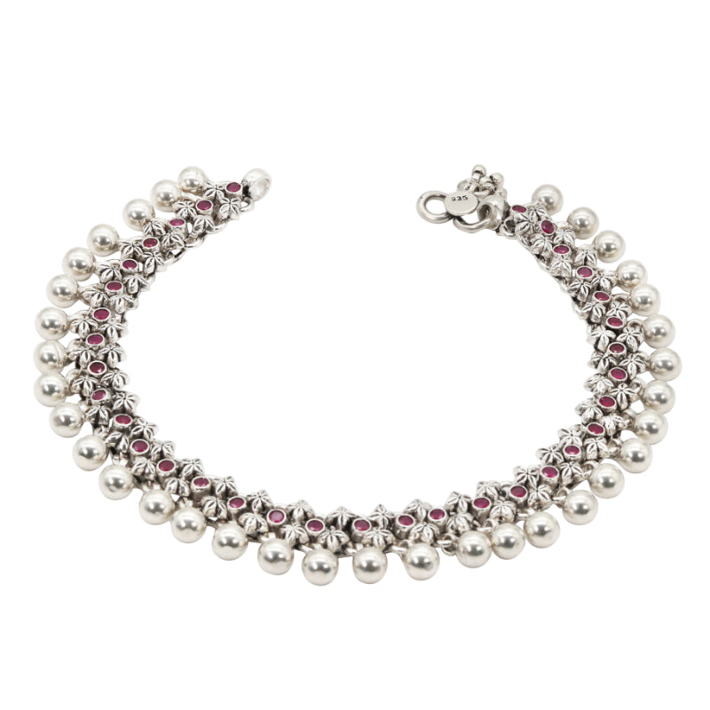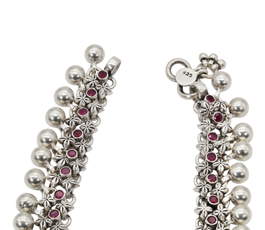 Adorn your ankles with the graceful Padma Latha Payal. These beautiful anklets are handcrafted from oxidized 92.5% sterling silver, featuring a delicate vine-like design embellished with tiny, vibrant semi-precious red stones that resemble blossoming flowers. The oxidized finish enhances the intricate detailing and gives them a timeless, antique charm.