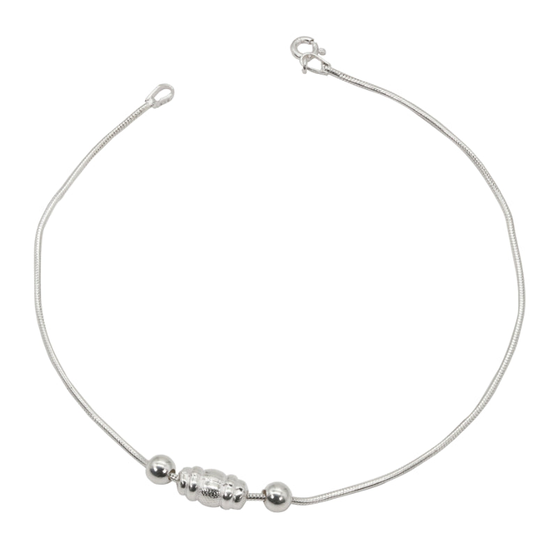 Adorn your ankles with the understated elegance of our 92.5 hallmark silver anklets. Each piece is meticulously crafted, featuring a delicate chain that gracefully encircles your ankle, punctuated by five perfectly spherical silver balls.