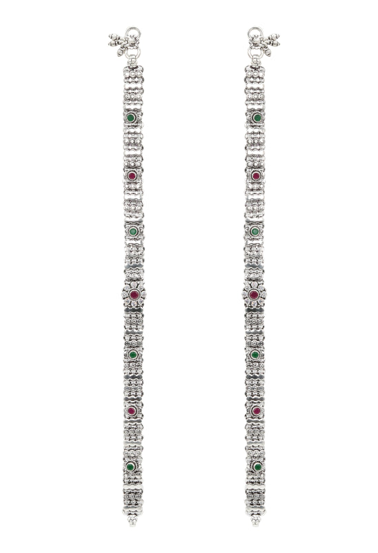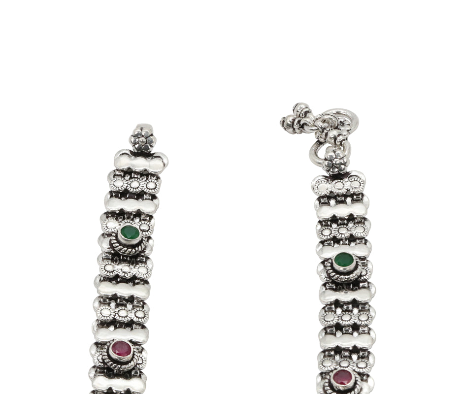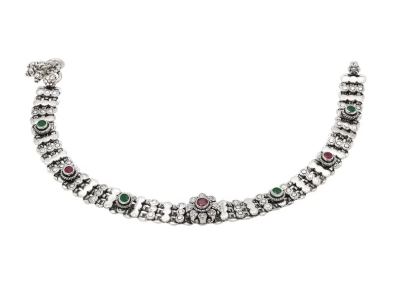 Adorn your ankles with the captivating beauty of the Pushpanjali, an exquisite anklet crafted in 92.5% oxidized sterling silver. This design showcases a series of delicate floral motifs, each embellished with vibrant semi-precious stones in rich red and green hues, complemented by sparkling cubic zirconia (CZ) stones.