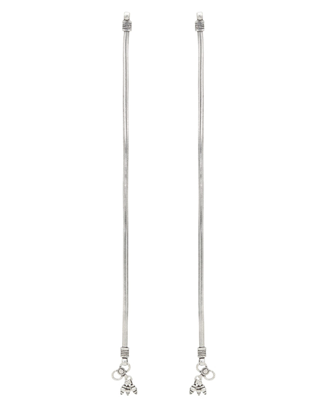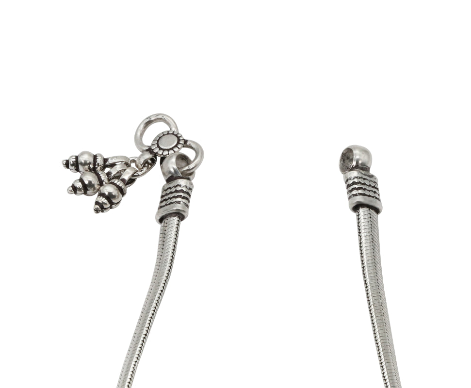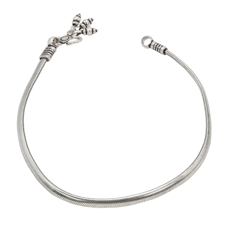 Adorn your ankles with the understated elegance of the Rajat Nadi payal, a beautifully crafted piece in polished sterling silver. This anklet features a smooth, continuous snake chain that gracefully contours the ankle.