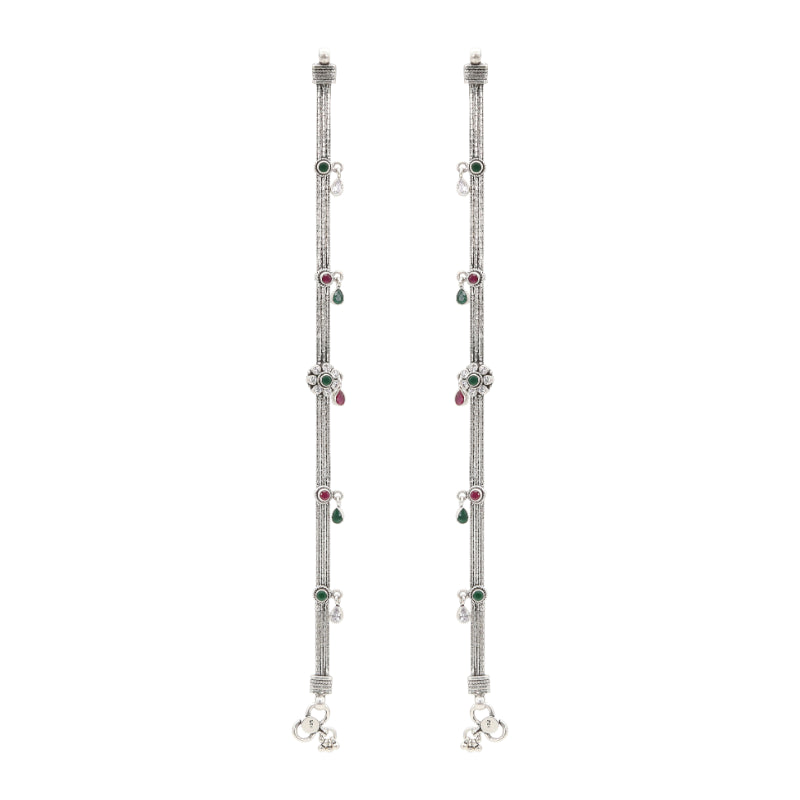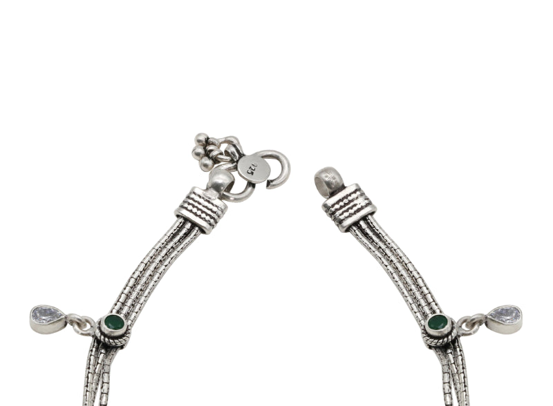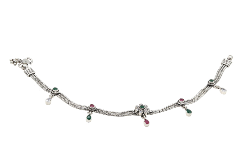 This exquisite anklet showcases a delicate, interwoven silver chain, perfect for adding a touch of subtle elegance to your ensemble. The chain is embellished with a series of small, colorful stones – a mix of deep red, rich green and pearlescent white – each encased in a detailed setting.