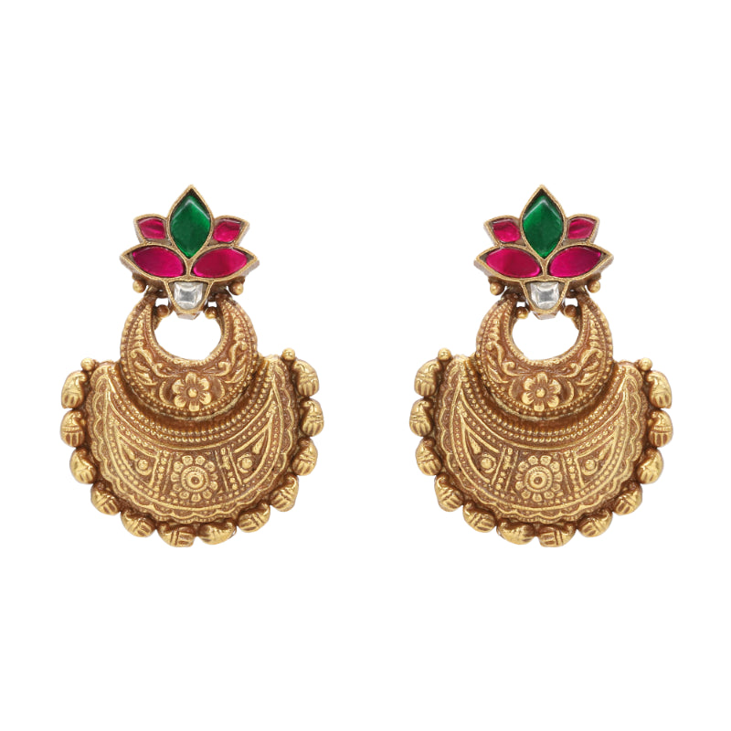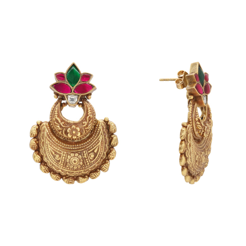 Celebrate the beauty of every season with the Ritu Kamal Chandbalis, a pair of earrings that embody the timeless elegance of Indian craftsmanship. Crafted from gold-plated 92.5 hallmarked silver, these earrings showcase a classic chandbali (crescent moon) silhouette, intricately detailed with traditional motifs.