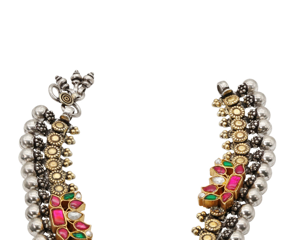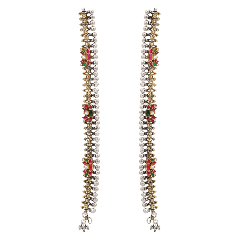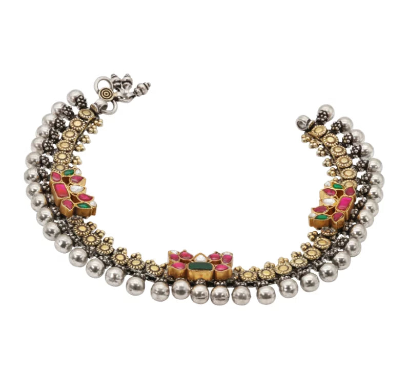 Adorn your feet with the regal splendor of the Roopkala Kundan Payal. This exquisite anklet is handcrafted from oxidized 92.5% sterling silver, showcasing a captivating blend of textures and traditional artistry. The design features intricate Kundan-inspired settings, embellished with vibrant semi-precious green and red stones, and sparkling cubic zirconia (CZ) accents.