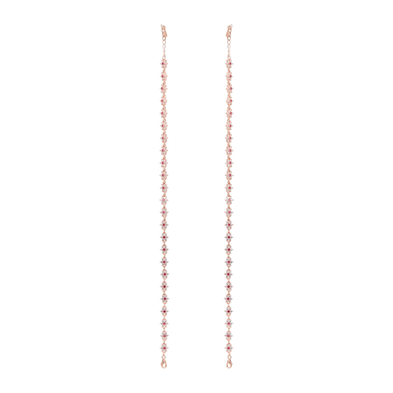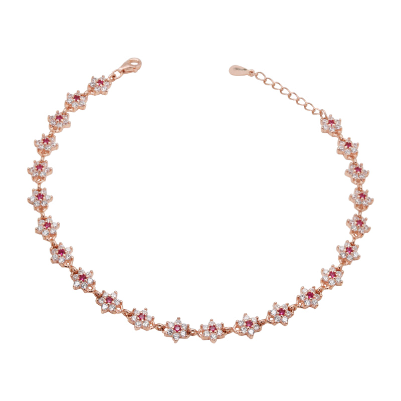 This delicate anklet is a beautiful fusion of traditional Indian craftsmanship and modern elegance. It features a graceful chain adorned with a series of dainty floral motifs, each set with a sparkling white stone and a touch of red for a vibrant contrast.