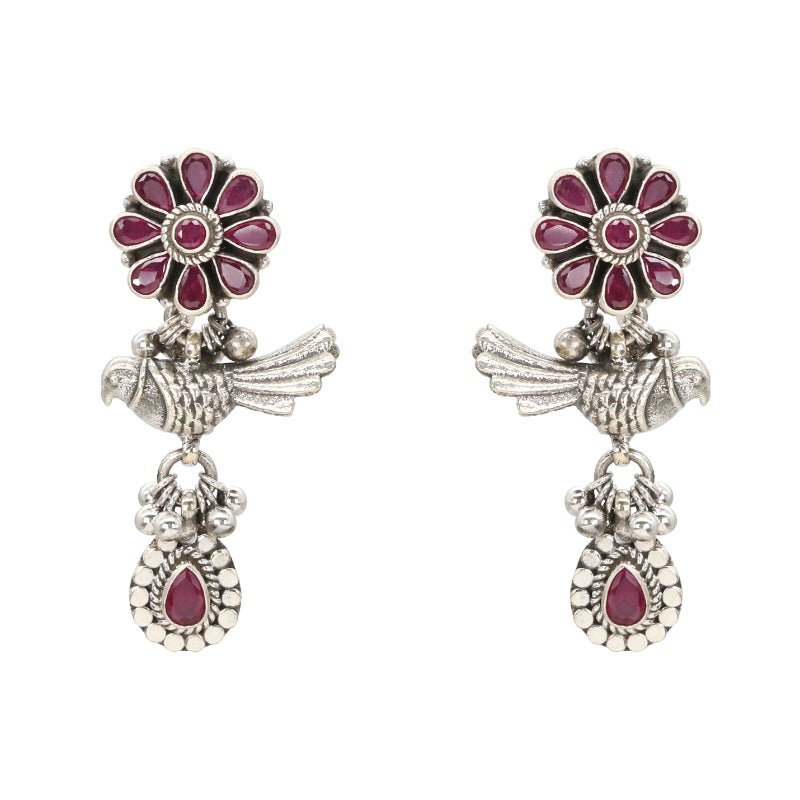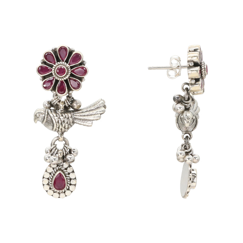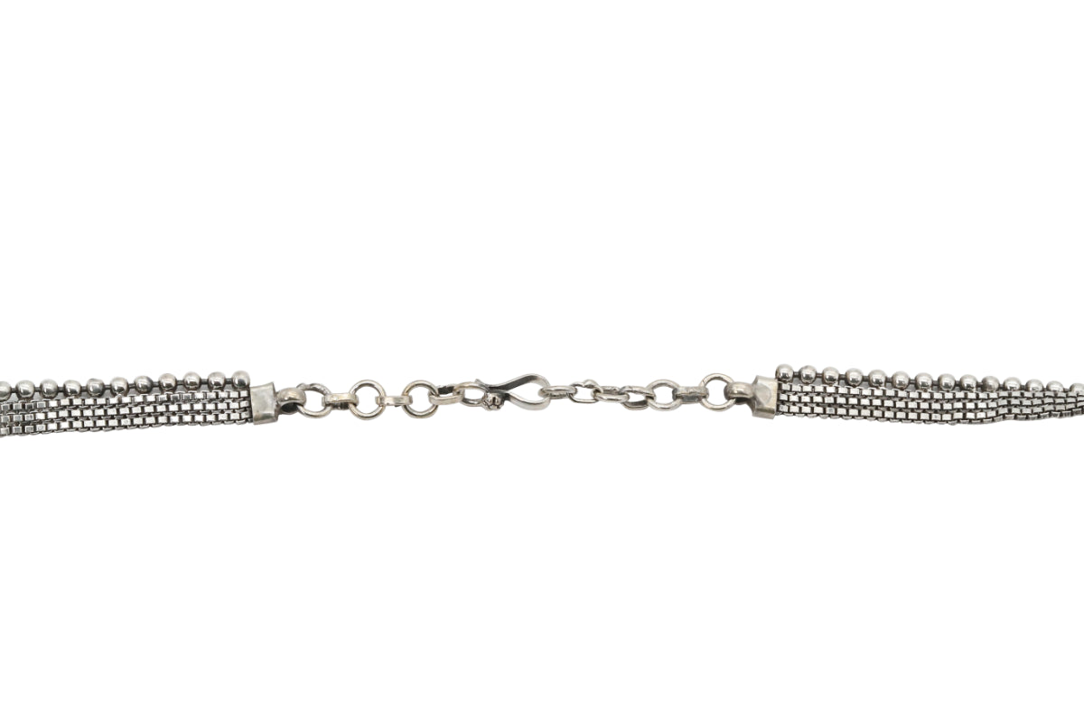 Adorn yourself with the graceful charm of this Oxidised Silver necklace. A striking teardrop pendant, featuring a rich red semi-precious stone, creates a focal point of subtle sophistication. The intricately beaded 92.5 hallmark silver chain complements this elegant design.