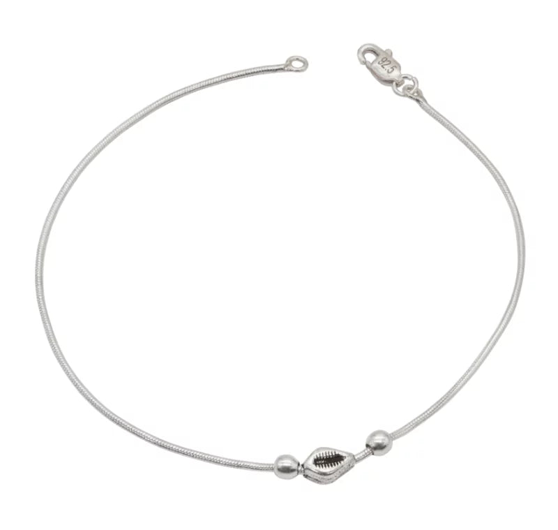 Adorn your ankles with the subtle charm of the Shankha Payal, a delicate anklet crafted in sleek sterling silver. This minimalist piece features a fine, smooth chain accented by two small silver beads that gracefully frame a central, intricately detailed shell motif.