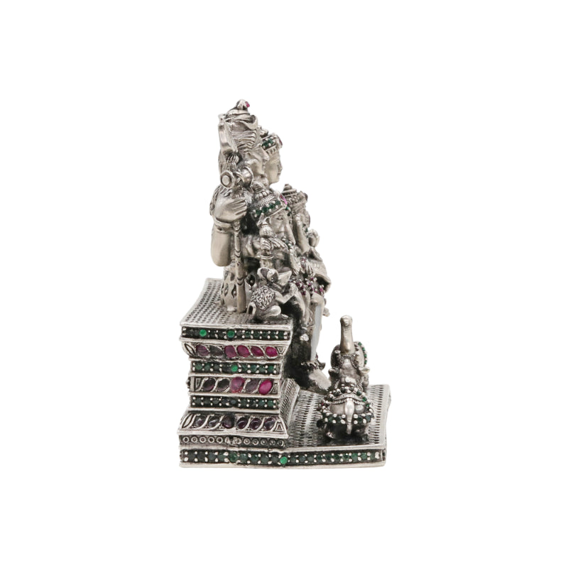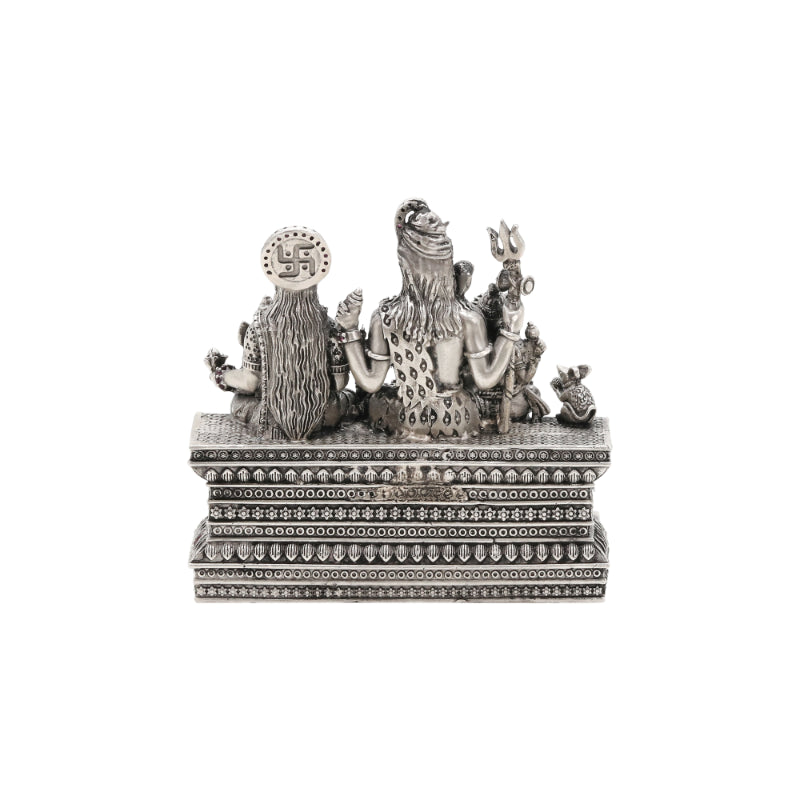 This exquisite 3D idol, depicting the divine Shiva family, is meticulously crafted from oxidized 92.5 hallmarked silver, showcasing a rich, antique finish.
