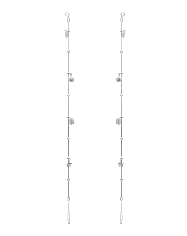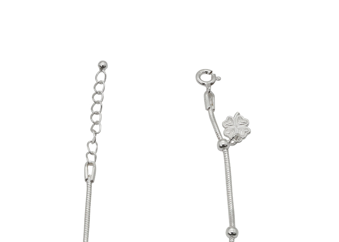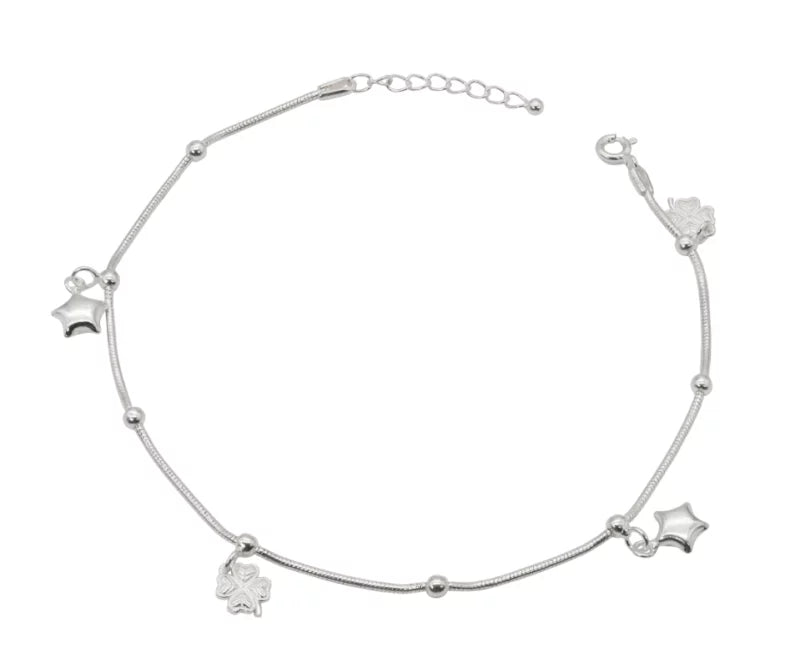 Adorn your ankles with the delightful whimsy of the Shubh Labh Payal, a charming anklet crafted in polished sterling silver. This delicate snake chain is punctuated by small silver beads and features a playful scattering of lucky charms, including stars and a four-leaf clover.