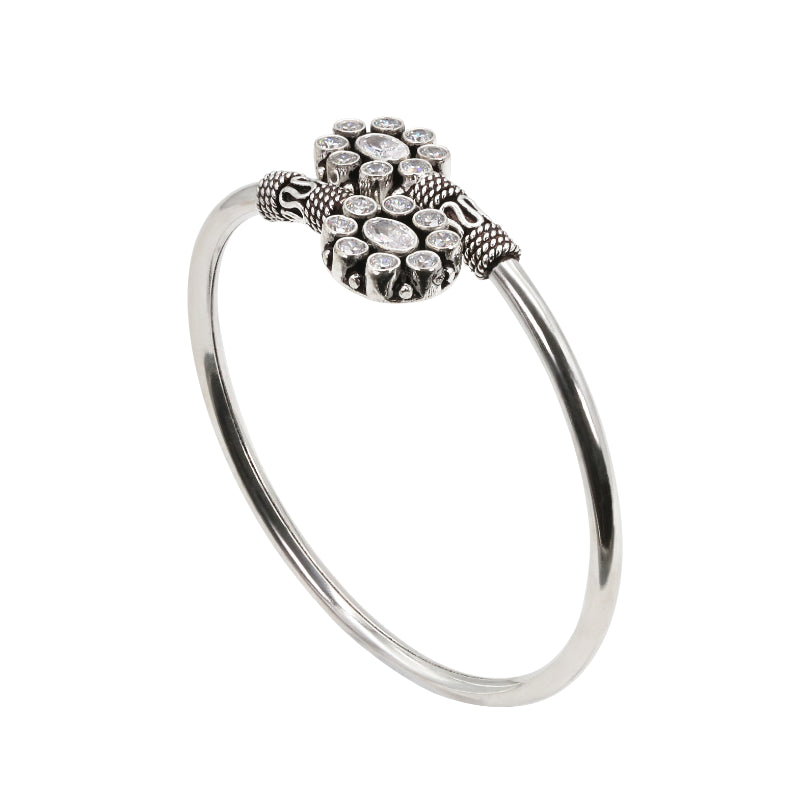 Illuminate your wrist with the radiant beauty of Shwet Pushpa bangle, a stunning 92.5 hallmark silver bangle. This open-ended kada features a captivating floral design, meticulously crafted with sparkling white stones.