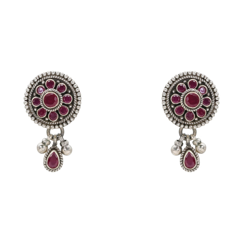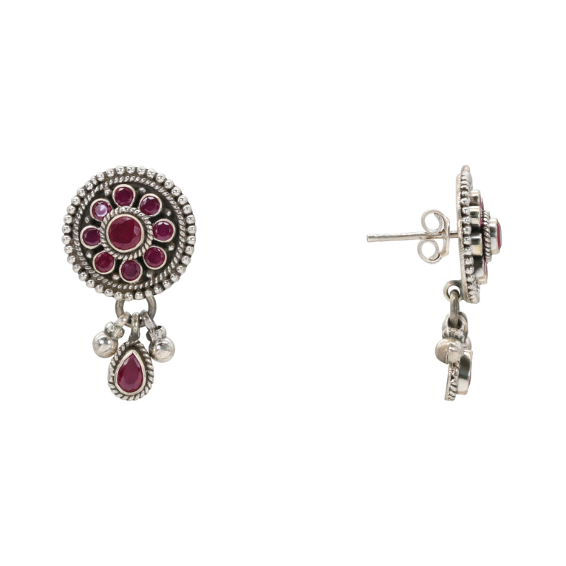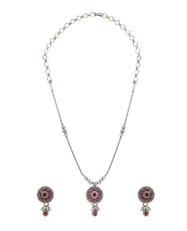 Adorn yourself with the enchanting Silver Glow & Rosewood Bloom Set. This 92.5 Hallmarked Sterling Silver necklace and earring combination features a dazzling, shiny chain leading to a beautifully oxidized pendant and coordinating earrings.