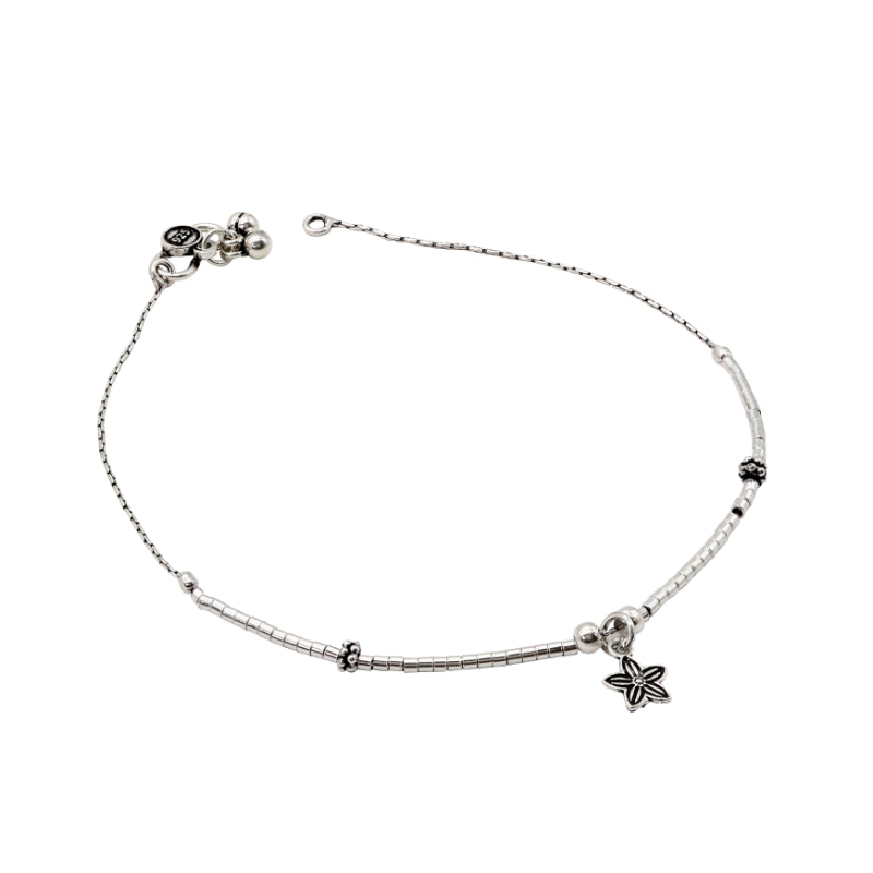 Adorn your ankle with the celestial charm of Tara Kiran Nupur, a beautifully crafted 92.5 hallmark silver anklet. This piece features a slender chain composed of alternating smooth and textured segments, creating a subtle yet captivating play of light.