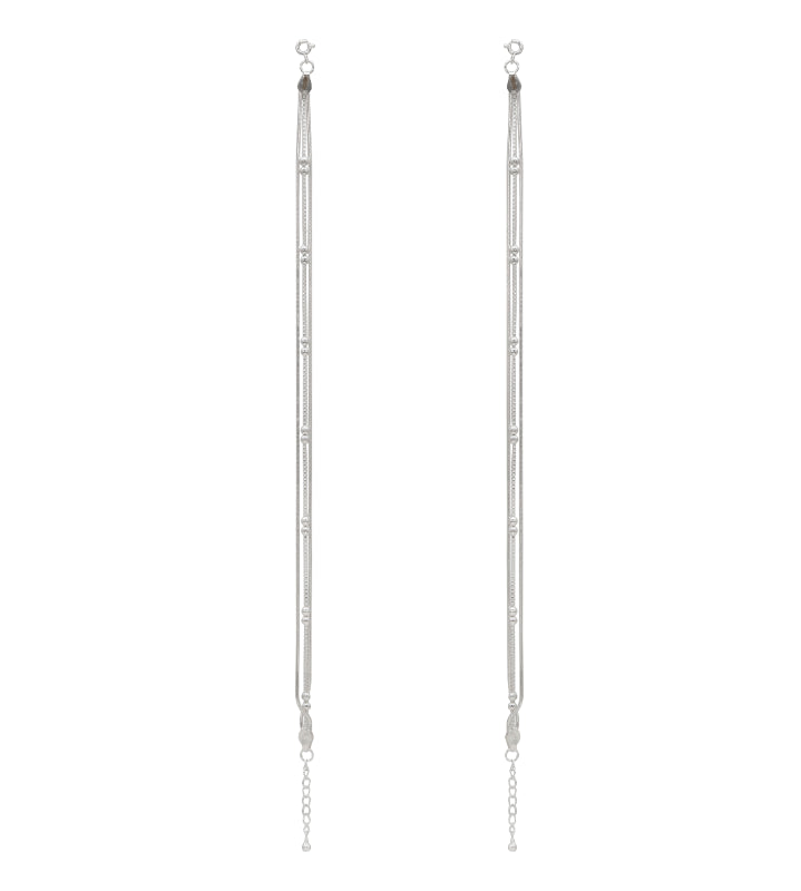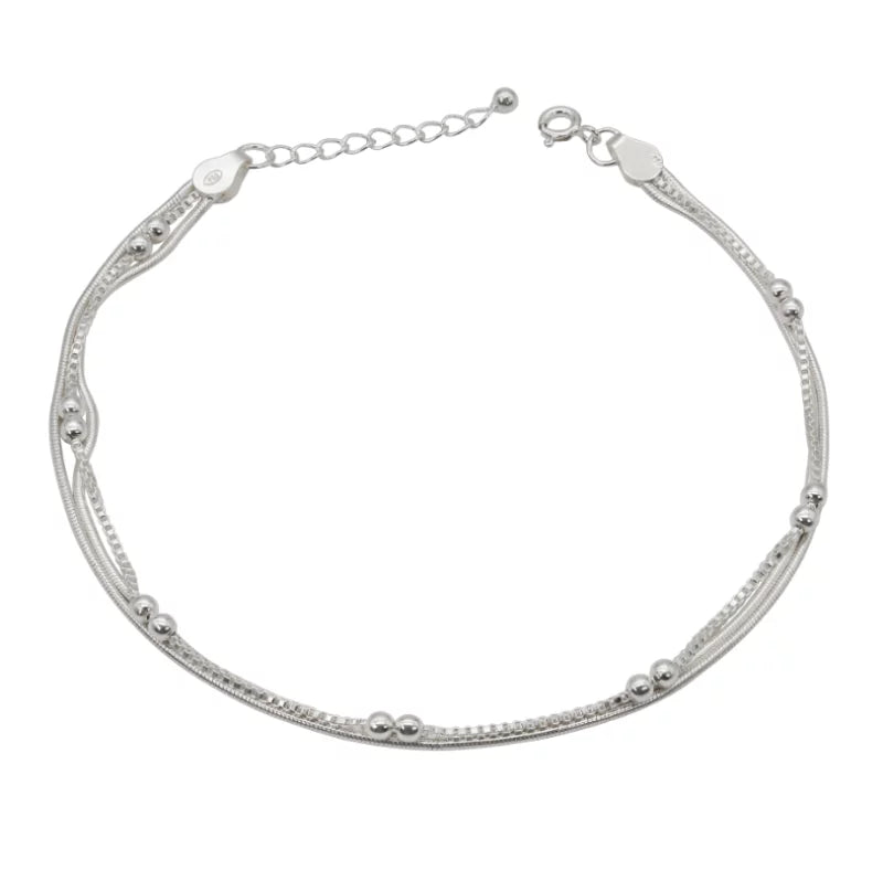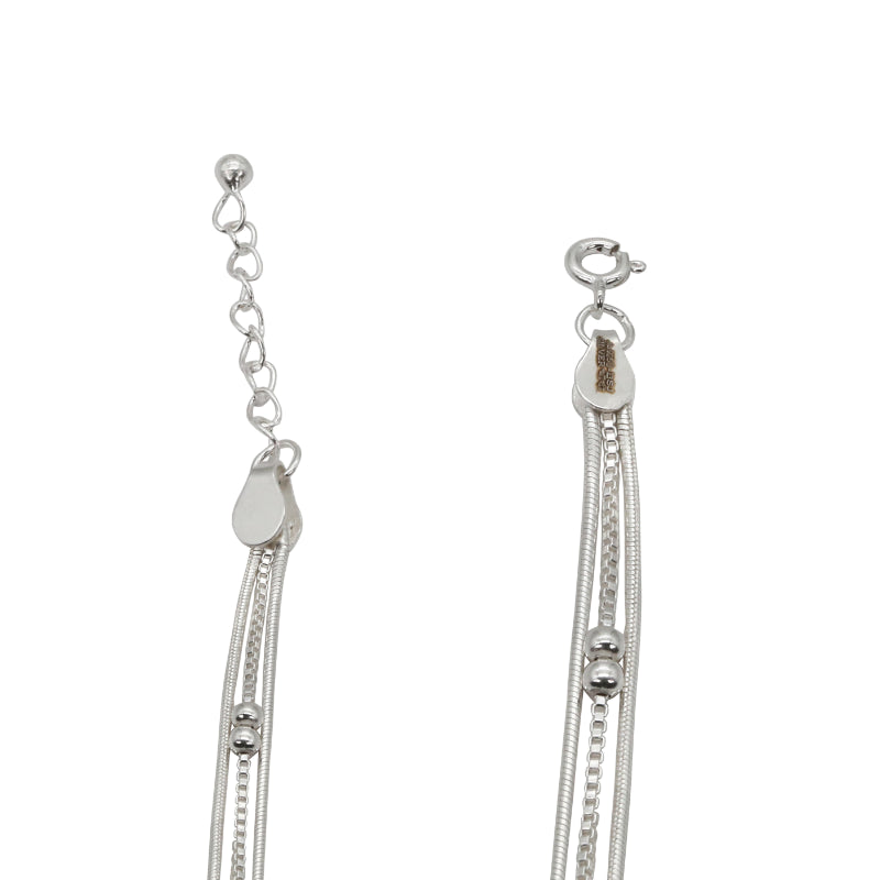 Adorn your ankles with the subtle texture and movement of the Tarang Moti anklet, crafted in sleek sterling silver. This contemporary piece features multiple delicate snake chains that flow together, each adorned with small, evenly spaced silver beads.
