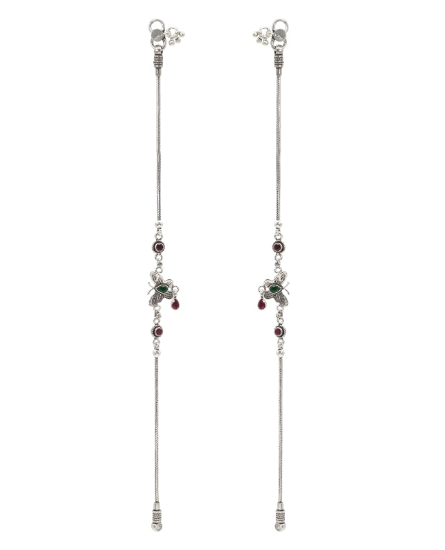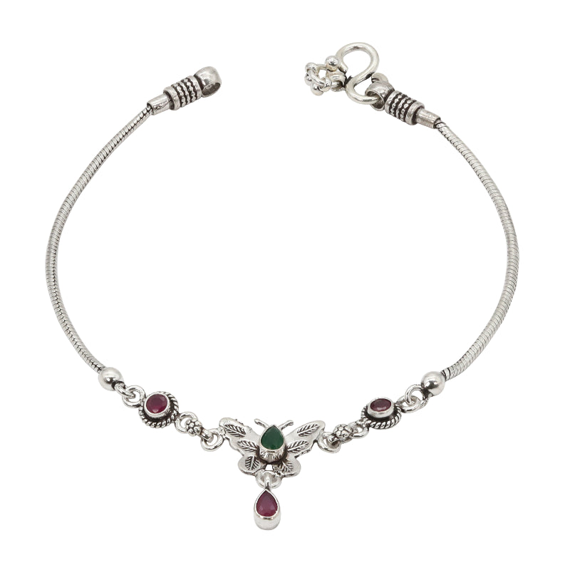 Let your spirit soar with the enchanting Titli Payal, a delightful anklet crafted in oxidized 92.5% sterling silver. This whimsical piece features a beautifully detailed butterfly motif at its center, adorned with a vibrant green stone and a dangling ruby red teardrop.