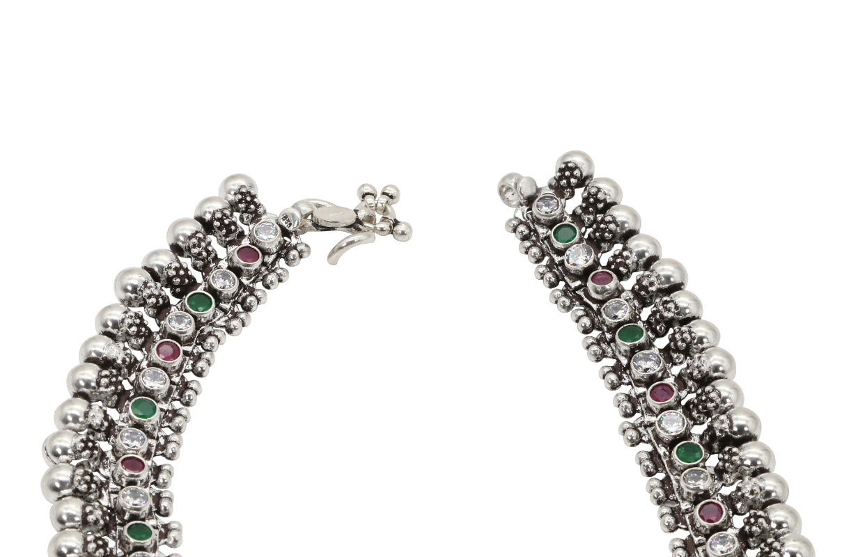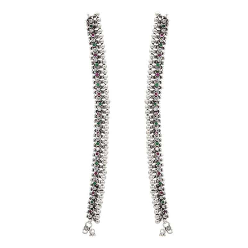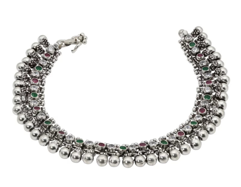 Embrace the intricate artistry of the Tribhanga Ratna Payal. These captivating anklets are handcrafted from oxidized 92.5% sterling silver, giving them a beautiful antique charm. The detailed design features rows of delicate silver beads interspersed with vibrant semi-precious green and red stones, along with sparkling cubic zirconia (CZ) accents.